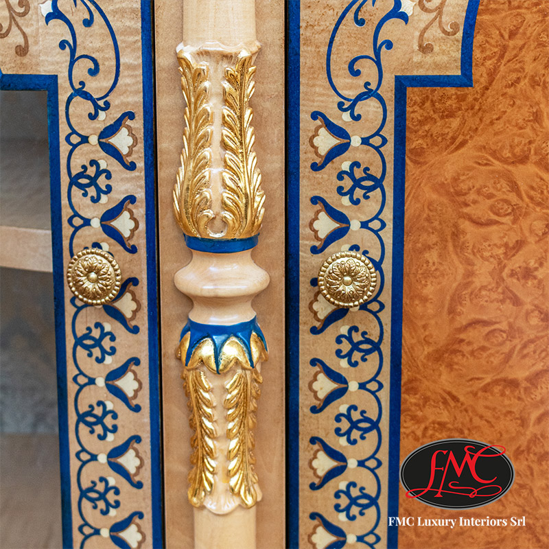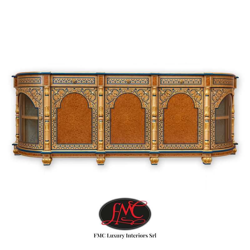 Credenza a cinque porte realizzata in acero e radica di acero, con intarsi in legni colorati. Particolari in legno intagliato.